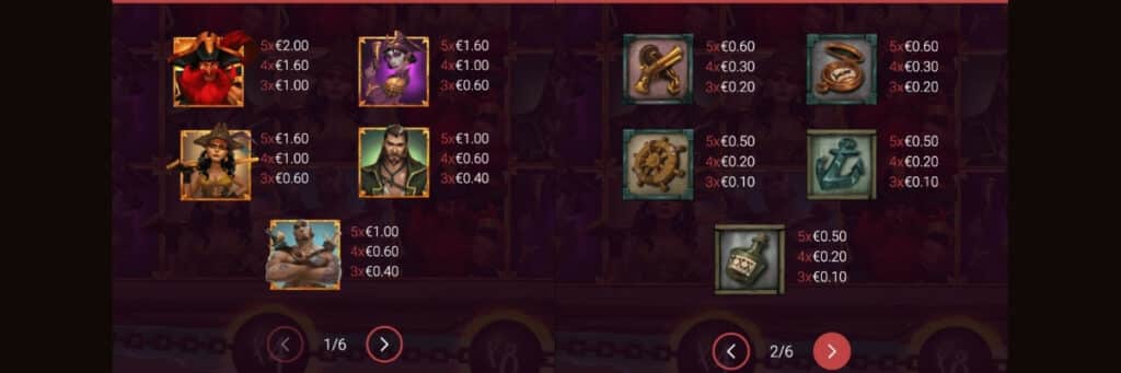 De lågt betalande symbolerna i spelet är en flaska rom, ett ankare, en ratt, en kompass och pistoler. Utbetalningar för en vinst med 5 symboler är mellan 2,5 och 3 gånger insatsen. De olika karaktärerna ger 5-10 gånger insatsen för en vinst med 5 symboler.
