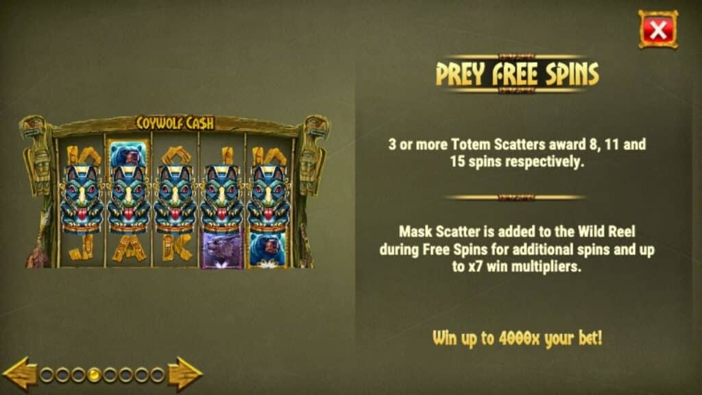Till vänster på bilden ser du den vanliga scattersymbolen i Coywolf Cash. Det är den som ger dig tillträde till omgången med gratis spins.
