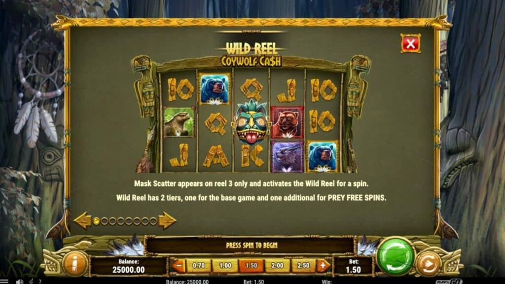 Det är här som scatter-masken och den isblå vargen kommer i bilden. Om masken landar på det mittersta hjulet aktiveras Wild Reel, det horisontella hjulet. Hjulet snurrar igång i sidled och här dyker bara den isblå Alpha Coywolf Wild och tomma positioner upp på hjulet. När hjulet stannar kommer de wilds som landat expandera nedåt och fylla hela det hjul den landat över.