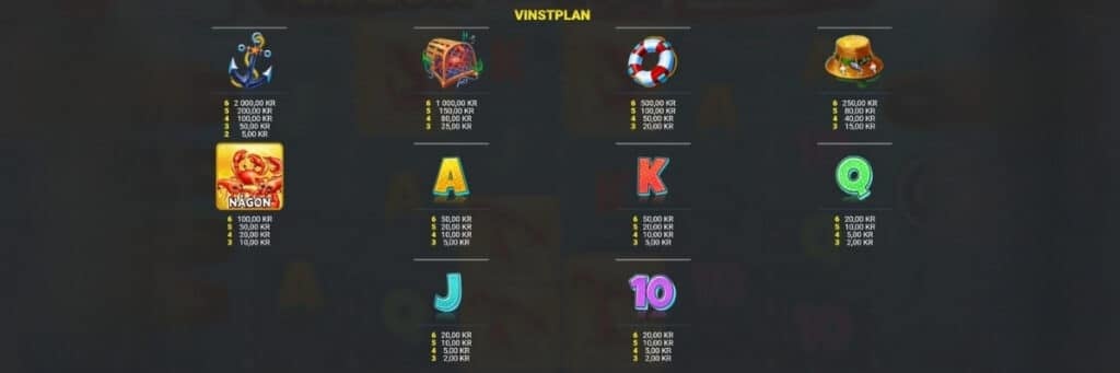 På bilden ovan ser du spelets utbetalningar vid en insats på 1 krona per snurr. De klassiska kortvalörerna 10, J, Q, K och A är de lägre symbolerna och betalar upp till 50 gånger insatsen för en vinst med 6 symboler. De högre betalande symbolerna är kräftor/räkor/krabbor, en hatt, livboj, kräftbur och ett ankare. Ankaret ger bäst vinst; 2 000 gånger insatsen för motsvarande vinst.