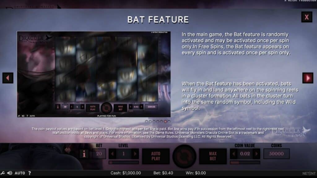 Håll ett öga på Dracula där han sitter jämte spelplanen. När som helst under grundspelet löses Dracula upp och förvandlas till en svärm av fladdermöss (vilket fantastiskt ord det är!) som sveper över spelplanen. De förvandlas sedan till en och samma slumpmässiga symbol, inklusive wildsymbolen. Här kan du få fina vinster och funktionen aktiveras faktiskt ganska ofta.