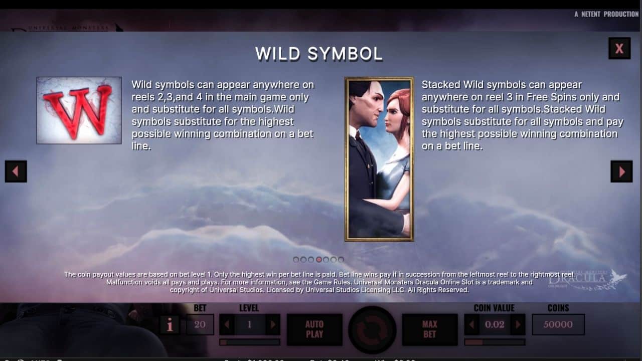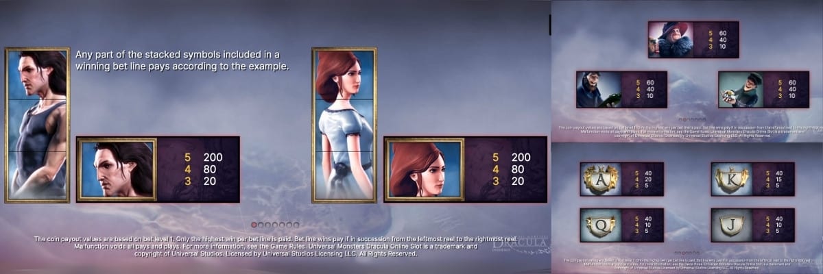 Svenska NetEnt har gjort ett bra jobb när det gäller designen på symboler. De högst betalande symbolerna är Dracula och kvinnan som ger dig 200 mynt för en vinst med 5 symboler (baserat på nivå 1). De tre karaktärerna ger 60 mynt för samma vinst. Lägst betalar de fyra kortsymbolerna – 40 mynt.
