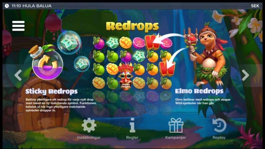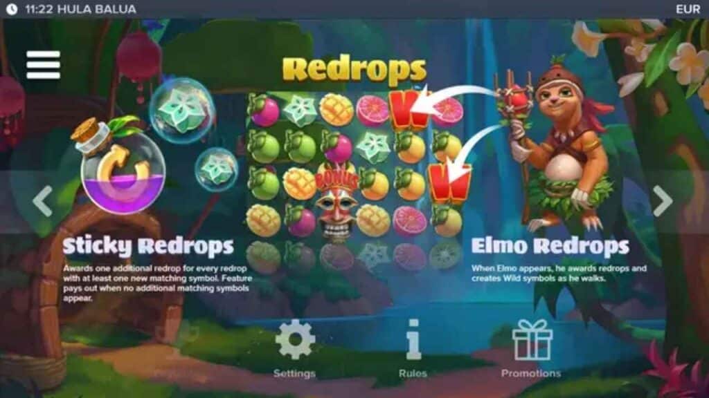 ELK Studios är duktiga på att lägga till extrafunktioner i sina spel, och Hula Balua är inget undantag. Här finns Sticky Redrops, Sammanslagna symboler, Elmo Redrops, Stora symboler, Multiplikatorer , free drops och slutligen X-iter som är ELK:s egen variant på köpfunktion.