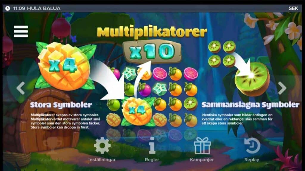 De högre betalande symbolerna är kiwi, mango, blodapelsin och en stjärnfrukt. Dessa betalar allt mellan 0,40 och 400 kronor, beroende på hur många du får upp – se bild nedan.