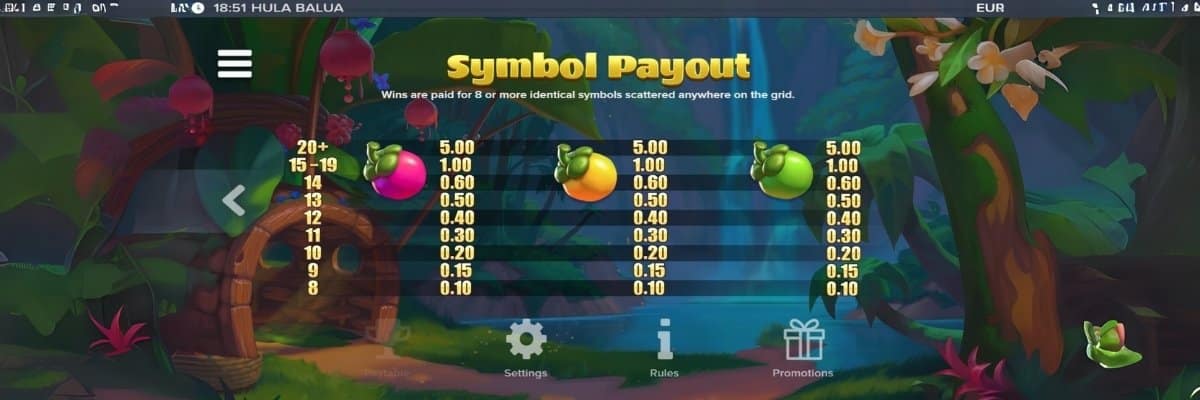 Hula Balua är en videoslot som har 6 hjul och 6 rader. Spelet har inga vinstlinjer, utan du får en vinst om du landar minst 8 likadana symboler var som helst på rutnätet, precis som det ser ut i exempelvis Rise of Atlantis 2. Vinnande symboler tas bort, och nya faller ner och fyller på, med chans till nya vinster. Spelet funkar precis lika bra i mobilen som på dator.