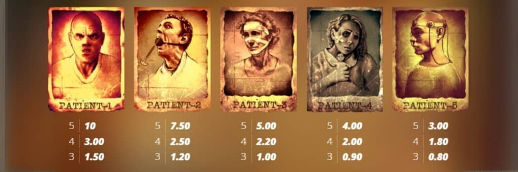 Premiumsymboler är de fem patienterna. Här får du 1,5-5 gånger din insats för motsvarande vinst. Summorna du ser i bilderna är utbetalningar baserade på 2 kr i insats.