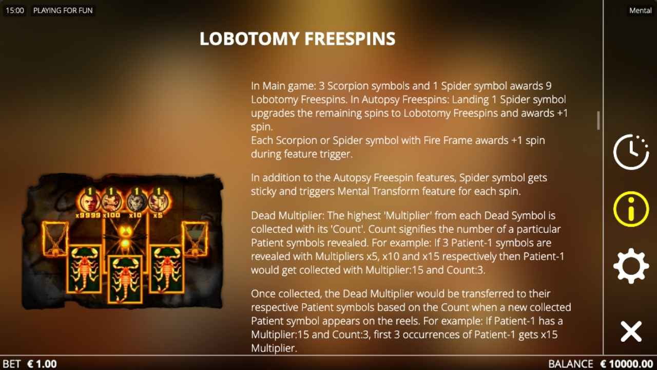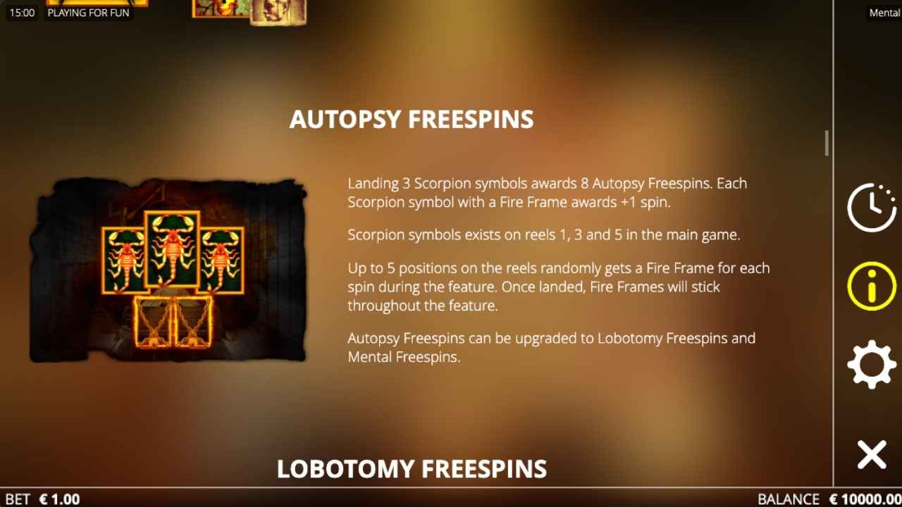 9 free spins får du med hjälp av tre Scorpionsymboler och en Spider-symbol. Du har samma funktioner som i Autopsy, men här stannar också Spidersymboler kvar och aktiverar Mental Transform i varje spin.