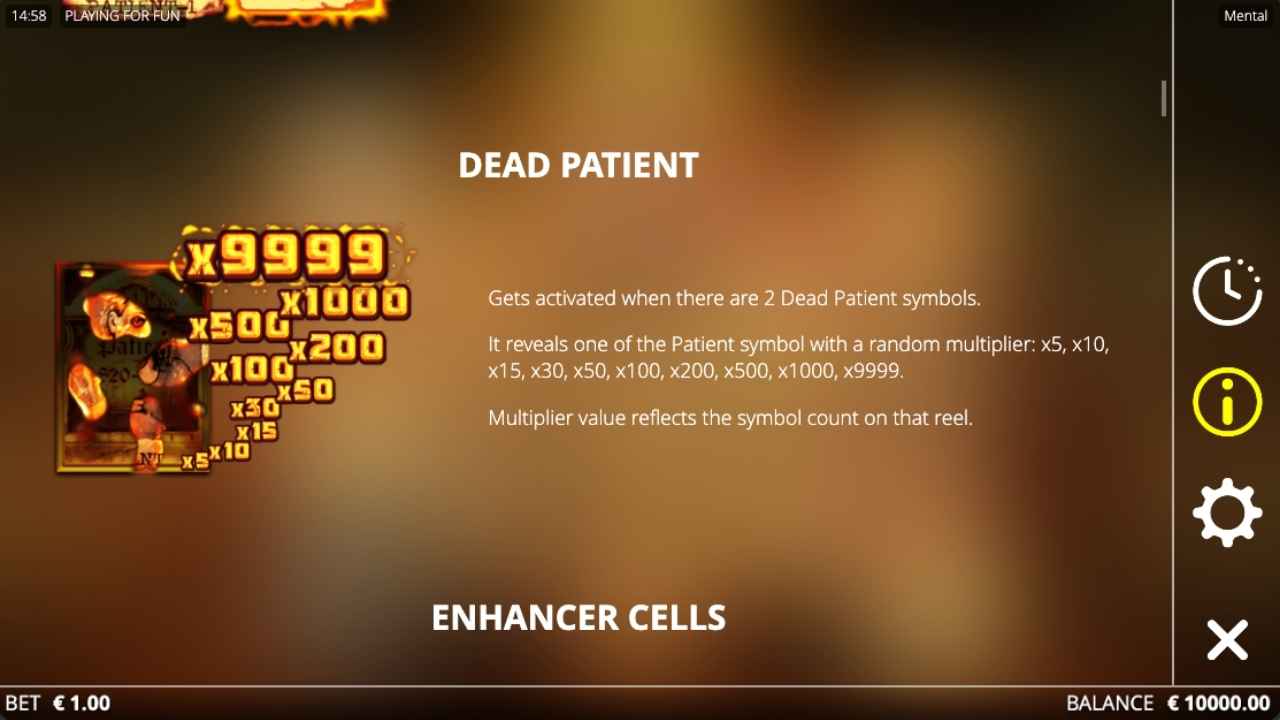 Det finns också en multiplikatorfunktion – Dead Multiplikator. Det högsta multiplikatorvärdet från Dead-symboler samlas in och räknas upp . När nya patientsymboler träffar, appliceras deras insamlade multiplikator på den , sedan dras 1 från räkningen. Landar 2 Spider Symbols uppgraderas du till Mental Freespins .