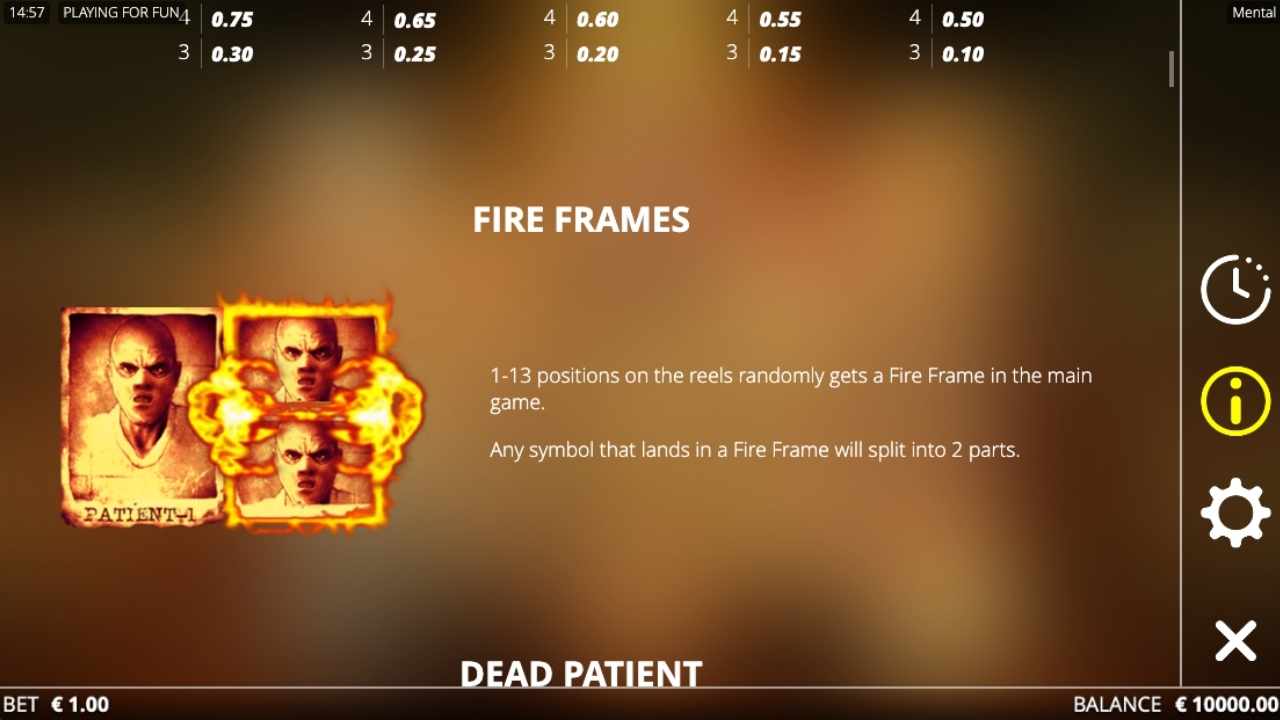 Nolimit City, som slog igenom med spelet Wixx, är inte rädda för att sticka ut. I Mental har man valt en riktigt creepy framtoning med de otäcka scenerna och karaktärerna som närmast ser ut att ha blivit torterade och inte behandlade på det här mentalsjukhuset. Ljudet förstärker det hela – vi hör egentligen bara den där läskiga tonen som brukar höras i filmer, när nån ska ner i källaren för att se vad som rör sig där… Humorfaktor i Mental: 0.