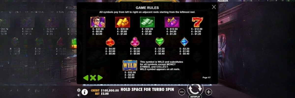 De lågbetalande symbolerna är kortfärgerna ruter, spader, hjärter och klöver, medan Lucky 7, pengabörsen, sedlarna och killen som håller i en diamant är de högbetalande symbolerna. Som mest kan du få 16x insatsen genom att landa 5 symboler.