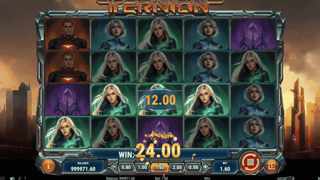 Ternion är en videoslot från svenska Play’n Go, med fem hjul, fyra rader och 20 vinstlinjer. Miljön är nån slags dystopisk värld med underliga varelser i bakgrunden, som syns genom den transparenta spelplanen.