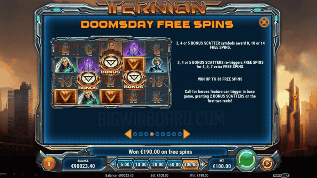 Scattersymbolen ser ut som en guldfärgad Rolexklocka, typ. Landa 3, 4 eller 5 scatters så får du 8, 10 respektive 14 Doomsday free spins. Funktionen ”Call for Heroes” kan aktiveras slumpmässigt i både grundspelet och i free spins, och den ger dig 2 scattersymboler på hjul 1 och 2.