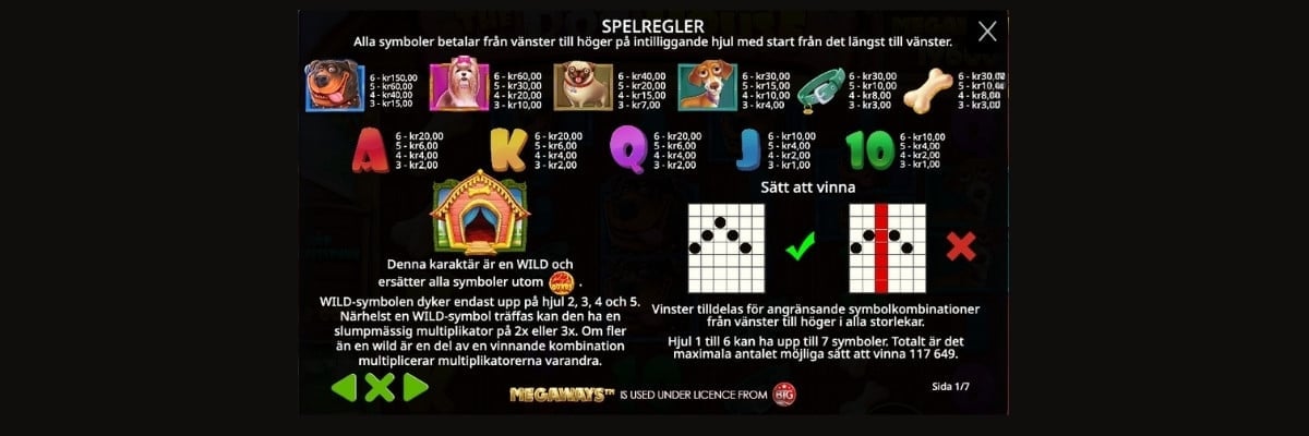De fyra hundarna (Tax, Mops, Shi Tzu och en Rottweiler) är stjärnorna i The Dog House Megaways, och de symboler som betalar bäst. För en vinst med 6 symboler får du 3, 4, 6, eller 15 kronor beroende på vilken symbol det är. Detta baseras på att du spelar med en insats på 2 kr per snurr.