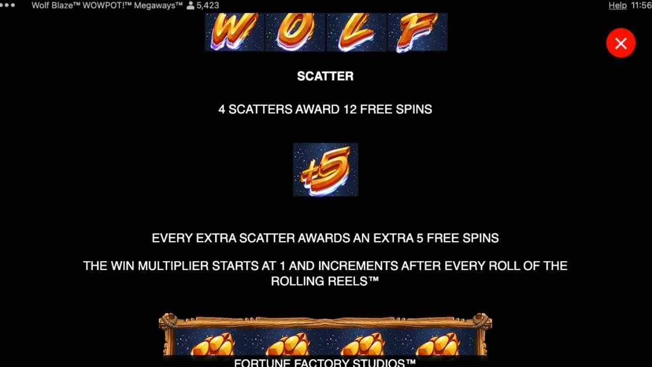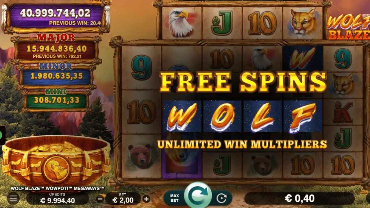 Free spins är (som vanligt) huvudrollsinnehavaren i Wolf Blaze WowPot Megaways. Fyra scattersymboler (W-O-L-F) ger dig 12 gratis spins. Får du upp fler än fyra får du ytterligare 5 free spins för var och en av dem.