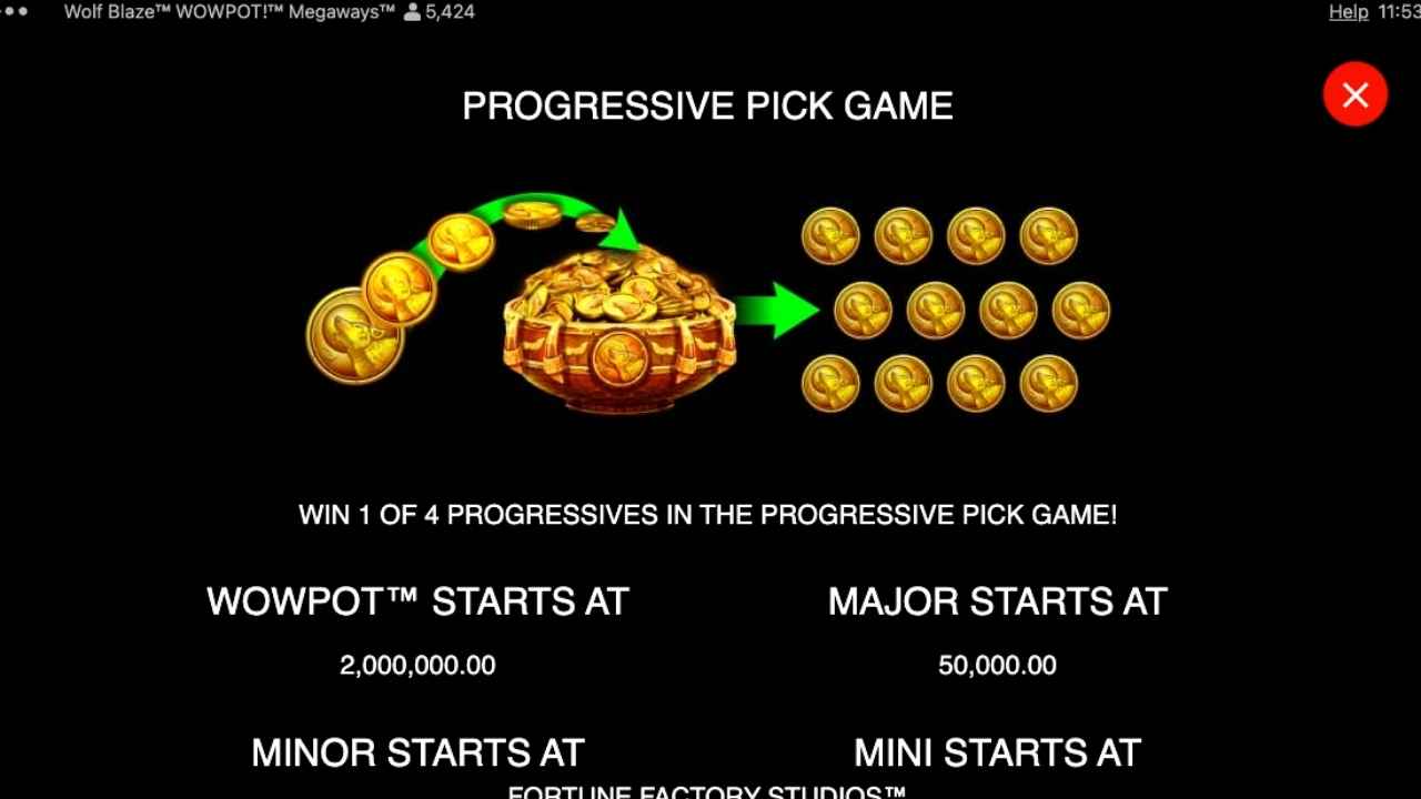 Originalet Wolf Blaze hade fasta jackpottar, men dessa är nu ersatta med Microgamings nätverk av WowPot! Jackpottar. Det är fyra olika jackpottar som har följande startvärden (som de återgår till när någon vunnit).